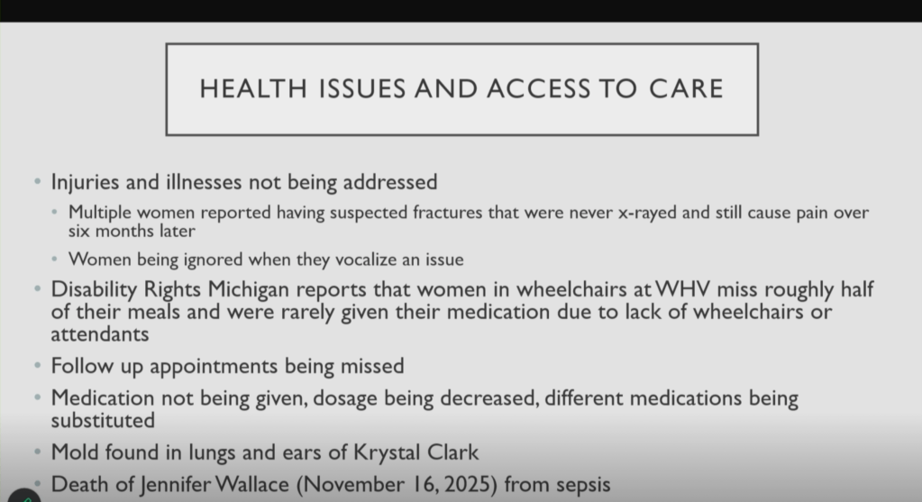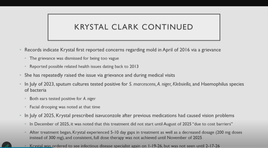 On February 24, 2026, Michigan Rep. Laurie Pohutsky presented her findings to the House Oversight Committee of the horrible and inhumane conditions at Women’s Huron Valley Facility, including the presence of mold and it’s impact on the residents of the prison. Rep. Pohutsky shared slides with images and details of Krystal’s health impacts due to mold exposure and the timeline of recent medical neglect experienced by Krystal, as well as other residents, which lead to the tragic death of Jennifer Wallace in November 2025.